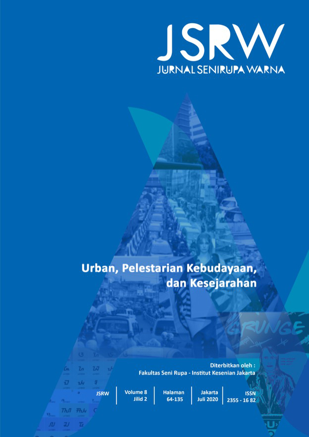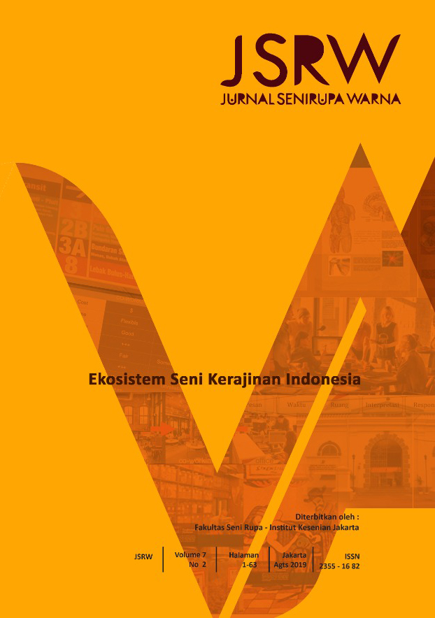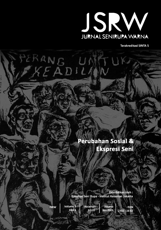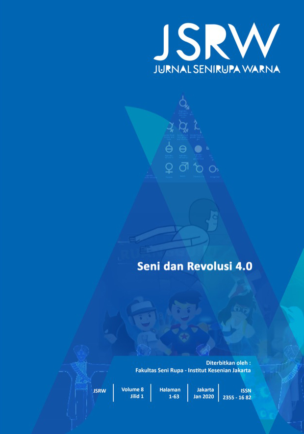 Vol 8 No 1 (2020)JSRW (JURNAL SENIRUPA WARNA) diterbitkan oleh Fakultas Seni Rupa Institut Kesenian Jakarta dua kali setahun, bulan Januari dan Juli. Dikelola oleh Fakultas Seni Rupa Institut Kesenian Jakarta bekerjasama dengan Asosiasi Desain Grafis Indonesia (Adgi), Forum Kriya Kontemporer Indonesia (FKKI), Indonesian Fashion Chamber (IFC). JSRW (JURNAL SENIRUPA WARNA) berisi tulisan yang merupakan artikel konseptual dan artikel hasil penelitian di bidang seni rupa dan desain, serta artikel telaah (review) yang dimuat atas undangan.