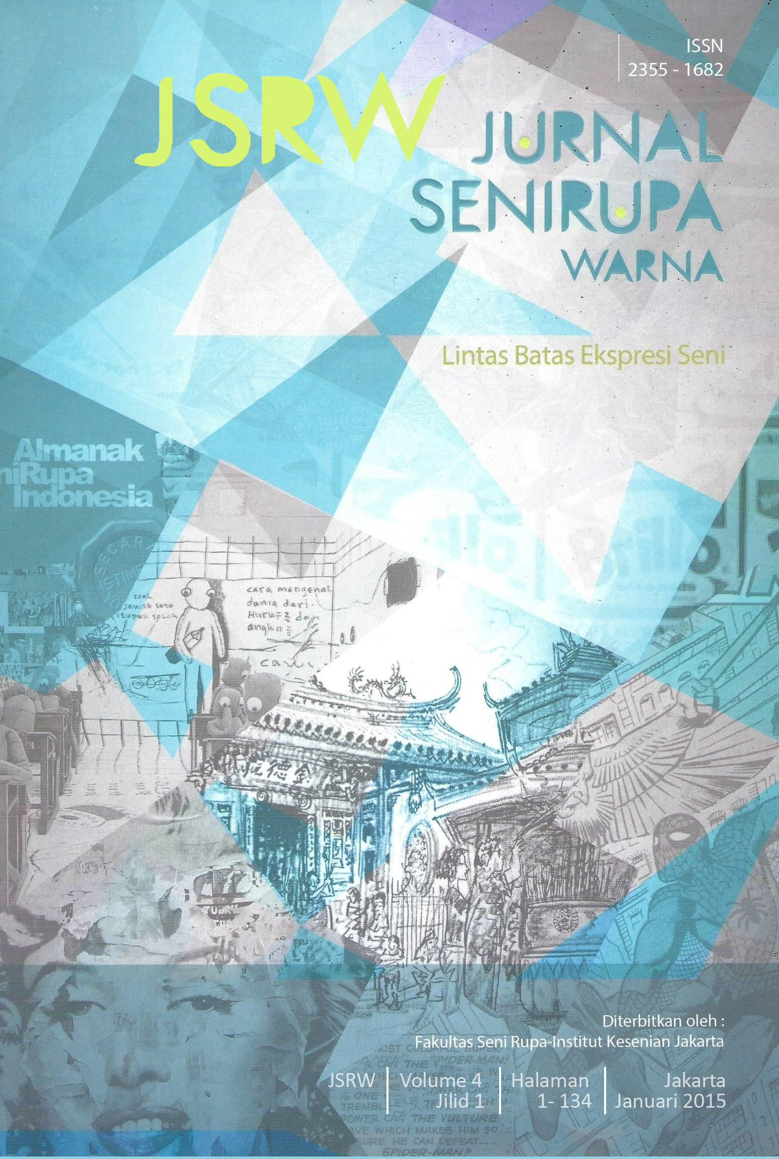 Vol 4 No 1 (2015)JSRW (JURNAL SENIRUPA WARNA) diterbitkan oleh Fakultas Seni Rupa Institut Kesenian Jakarta dua kali setahun, bulan Januari dan Juli. Dikelola oleh Fakultas Seni Rupa Institut Kesenian Jakarta bekerjasama dengan Asosiasi Desain Grafis Indonesia (Adgi), Forum Kriya Kontemporer Indonesia (FKKI), Indonesian Fashion Chamber (IFC). JSRW (JURNAL SENIRUPA WARNA) berisi tulisan yang merupakan artikel konseptual dan artikel hasil penelitian di bidang seni rupa dan desain, serta artikel telaah (review) yang dimuat atas undangan.