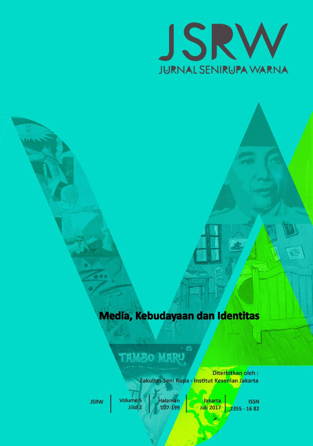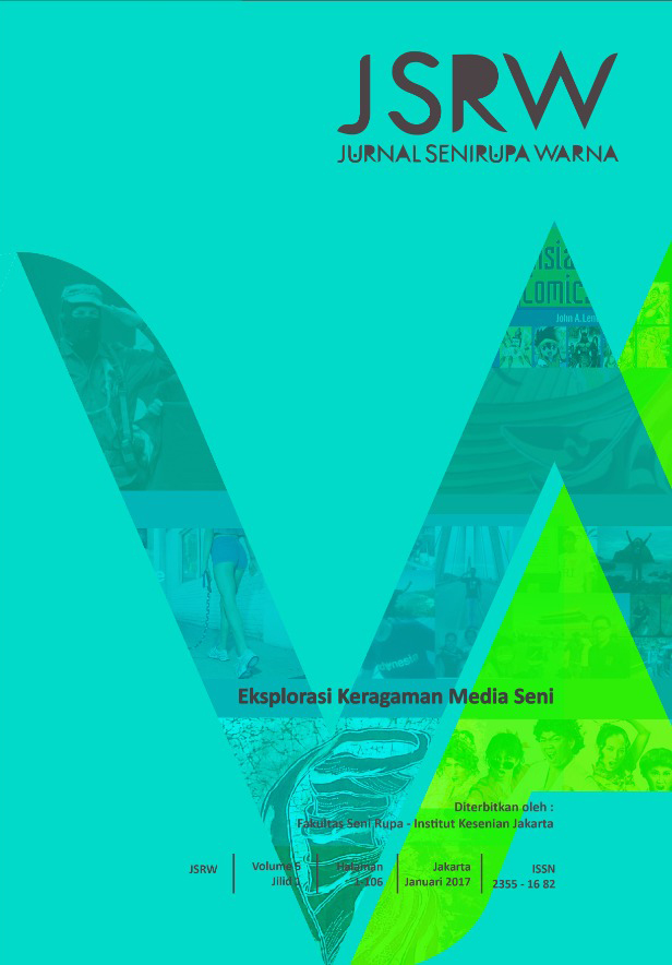 Vol 5 No 1 (2017)JSRW (JURNAL SENIRUPA WARNA) diterbitkan oleh Fakultas Seni Rupa Institut Kesenian Jakarta dua kali setahun, bulan Januari dan Juli. Dikelola oleh Fakultas Seni Rupa Institut Kesenian Jakarta bekerjasama dengan Asosiasi Desain Grafis Indonesia (Adgi), Forum Kriya Kontemporer Indonesia (FKKI), Indonesian Fashion Chamber (IFC). JSRW (JURNAL SENIRUPA WARNA) berisi tulisan yang merupakan artikel konseptual dan artikel hasil penelitian di bidang seni rupa dan desain, serta artikel telaah (review) yang dimuat atas undangan.
