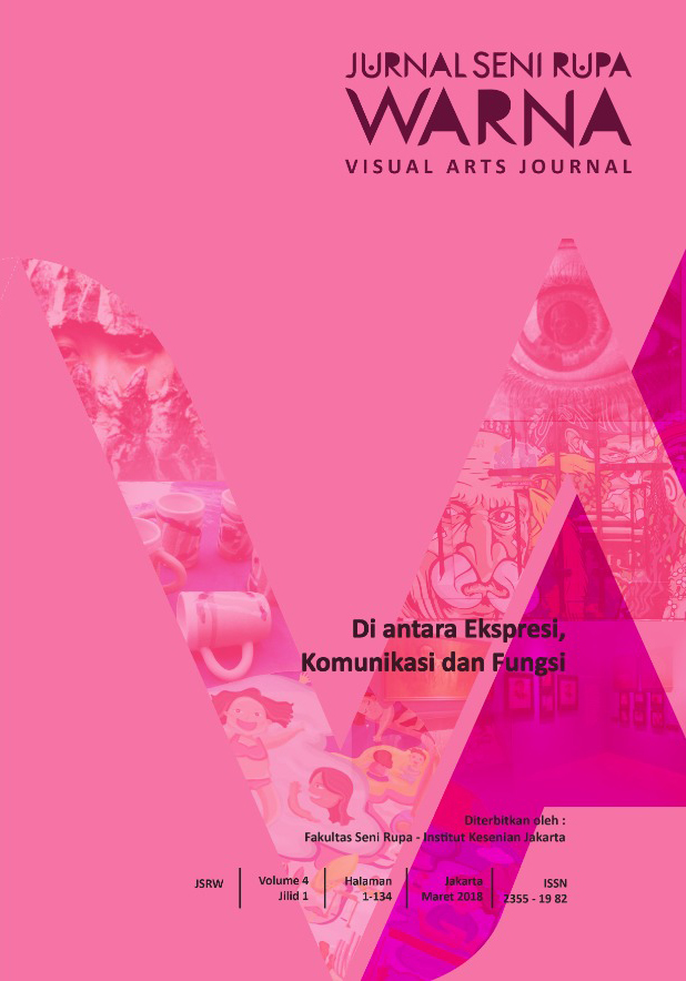 Vol 6 No 1 (2018)JSRW (JURNAL SENIRUPA WARNA) diterbitkan oleh Fakultas Seni Rupa Institut Kesenian Jakarta dua kali setahun, bulan Januari dan Juli. Dikelola oleh Fakultas Seni Rupa Institut Kesenian Jakarta bekerjasama dengan Asosiasi Desain Grafis Indonesia (Adgi), Forum Kriya Kontemporer Indonesia (FKKI), Indonesian Fashion Chamber (IFC). JSRW (JURNAL SENIRUPA WARNA) berisi tulisan yang merupakan artikel konseptual dan artikel hasil penelitian di bidang seni rupa dan desain, serta artikel telaah (review) yang dimuat atas undangan.